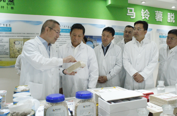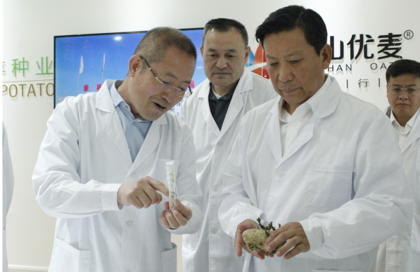 段志強(qiáng)一行首先參觀了民豐種業(yè)脫毒組培中心展廳,詳細(xì)了解了馬鈴薯脫毒種薯生產(chǎn)過(guò)程及企業(yè)發(fā)展情況。張國(guó)介紹,內(nèi)蒙古民豐種業(yè)有限公司成立于2008年,注冊(cè)資本1.3億元,已累計(jì)完成投資10億元以上,公司已發(fā)展成為集馬鈴薯種薯、訂單薯生產(chǎn)及馬鈴薯、燕麥深加工于一體的全產(chǎn)業(yè)鏈集團(tuán)化企業(yè),是“農(nóng)業(yè)產(chǎn)業(yè)化國(guó)家重點(diǎn)龍頭企業(yè)”、“國(guó)家高新技術(shù)企業(yè)”、“自治區(qū)扶貧龍頭企業(yè)”。目前,公司已發(fā)展成為一家融合農(nóng)業(yè)和食品加工業(yè)的全產(chǎn)業(yè)鏈集團(tuán)化公司,形成以食品加工帶動(dòng)農(nóng)業(yè),以農(nóng)業(yè)服務(wù)食品加工,一、二、三產(chǎn)融合、農(nóng)商互聯(lián)齊頭并進(jìn)的良性發(fā)展業(yè)務(wù)格局。